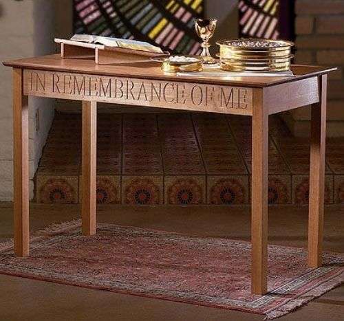The wooden table with pecan stain is durable and easy to care for. The communion table has “In Remembrance of Me” engraved across the front.